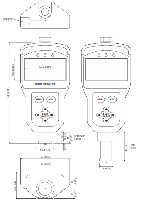 TKX Digital Durometers have three modes; peak, timer hold which records the creep phenomenon* and real time. Auto average averages a user-selectable number of peak readings. Hardness data can be transmitted via USB to PCs or saved in the 400 data memory. Optional SW-1-TK data acquisition software is available. Standard probe and long probe models are available. Operates on an internal rechargeable battery or AC adapter.